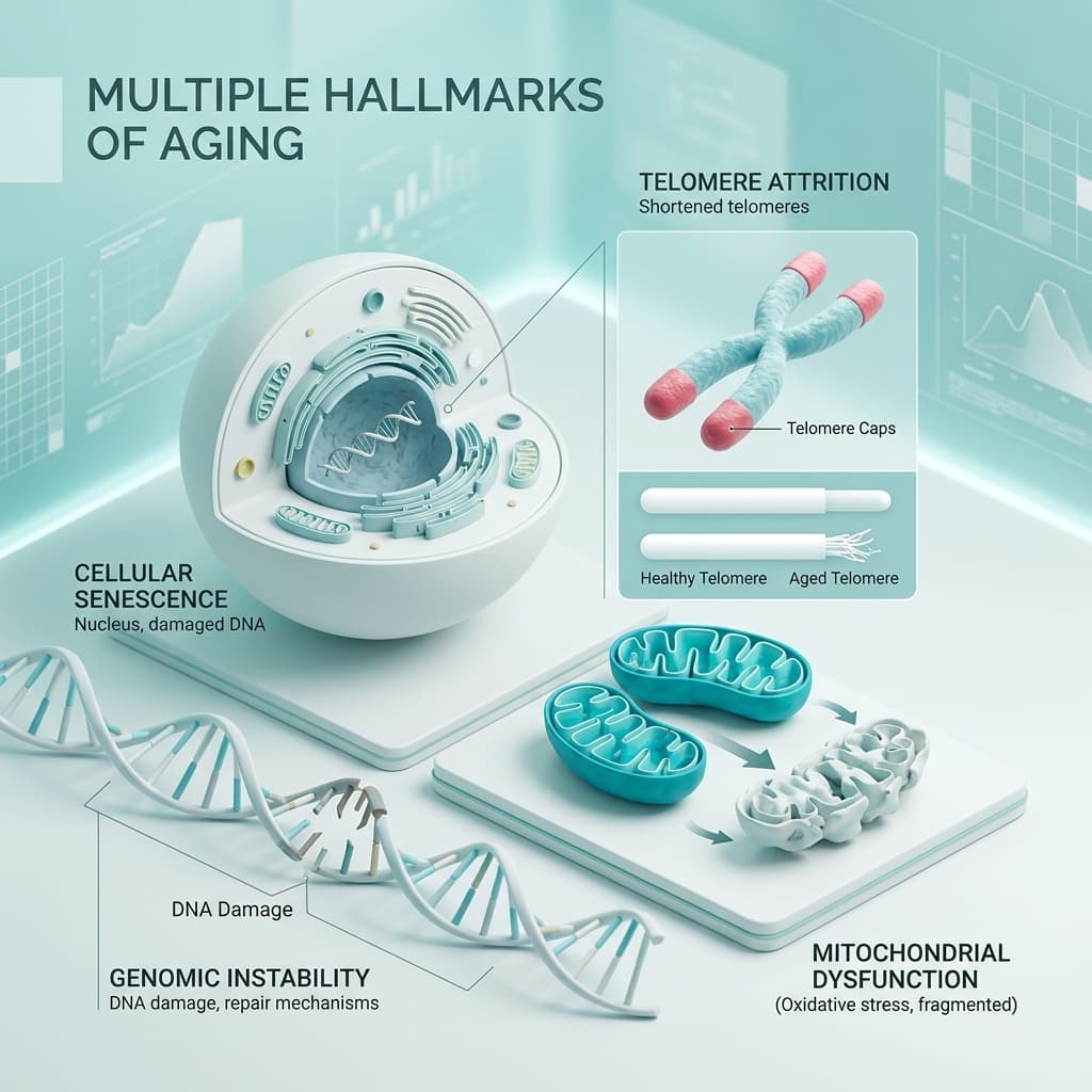 Aging isn't a single thing that happens to you. It's a collection of biological processes — DNA damage accumulating, cells losing their ability to divide, proteins misfolding, inflammation creeping upward — all unfolding at different rates in different tissues.